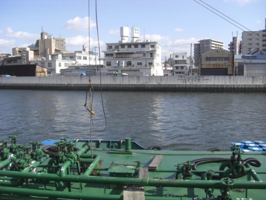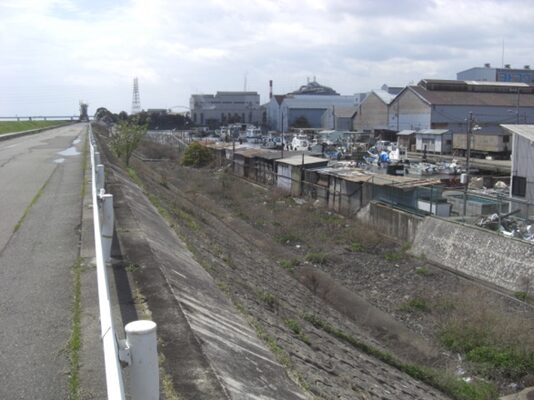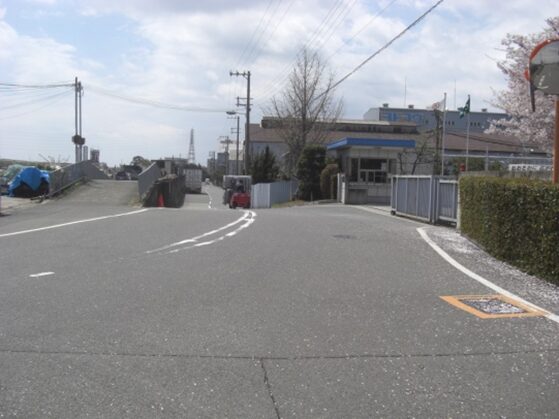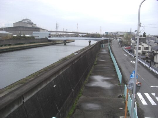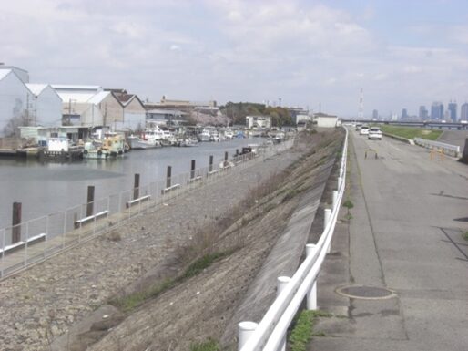 中島から神崎川に架かる城島橋を渡り、対岸の西島へ入る、橋を渡り真っ直ぐ進みたいが中山鋼業の大きな工場で道はなくなっているので、北東へ(左に神崎川・右に中山鋼業)進み、300m程先の三角州の先端で、大きく右にUターン、神崎川から分かれた西島川を左に、右に中山鋼業みて進む。