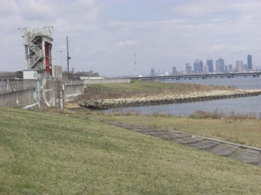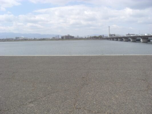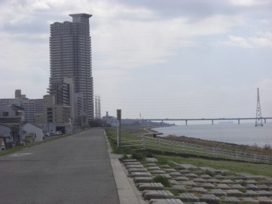 堤防を降りる所から、淀川の河口(西)の遠望遠くに見える橋は、湾岸線