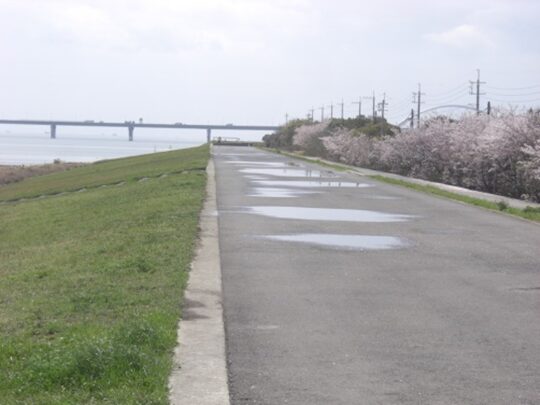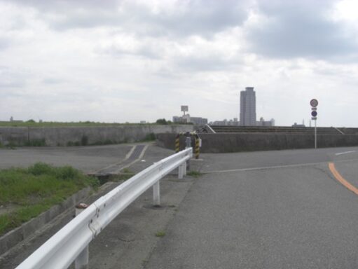 川沿いに出るのがまた工場敷地内等でまたややこしい。前述の信号を渡り、高速・国道を右に沿って、国道の左を進み、一筋目を左に折れ、すぐまた次の交差点で右に折れ堤防道に上がる
