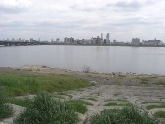 神社を少し南に行くと。神崎川の堤防に突き当たるので左に神崎川に沿って南東(河口)に進む