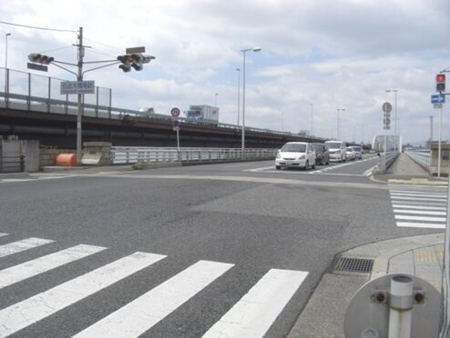 伝法大橋北詰の交差点を振り返ると、正面左より堤防を進んできたところ