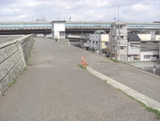 途中から南に入った道、その先で神崎川の堤防に突き当たるので左に折れる