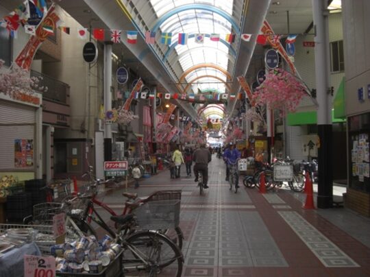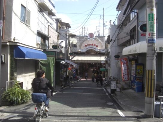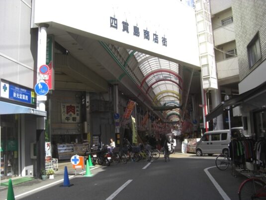 商店街を阪神なんば線が高架で横断、左が千鳥橋駅