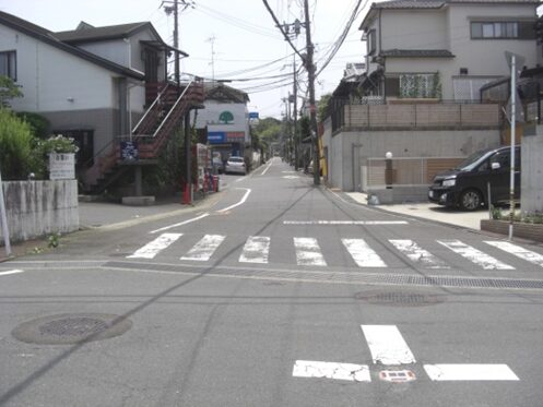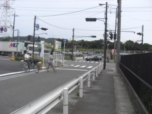 右の枚方津田高校を見て進むと、307号線の道路を横断する