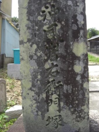 墓地入り口左 道標 「沖・・岩右衛門塚」
