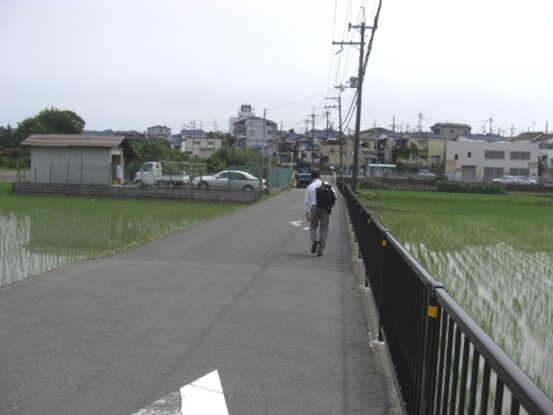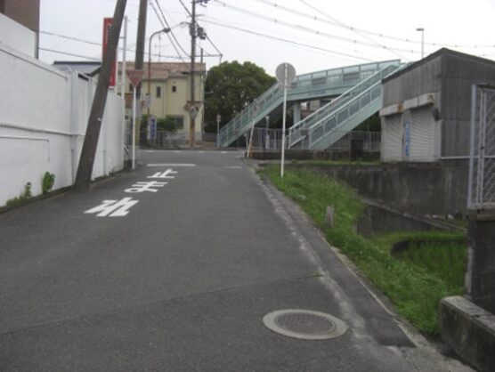 踏切を渡り、すぐのところの突き当たり道を左に線路と平行して進む