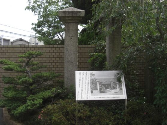 かつてこの三本の石柱は、菅原小学校が開校した明治四十年三月一日から、正門改修工事が行われた平成十七年七月までの九十九年間、正門に使用され皆さんに愛されていたもので、正門前に埋めている正方形の石のところに建っていたものです。永年にわたり地域に親しまれてきた正門の象徴として、末永く学校と地域がともに栄え発展して行くことを願い、菅原小学校創立百周年記念を機会に、ここに移し後世に伝えます。(枚方市)