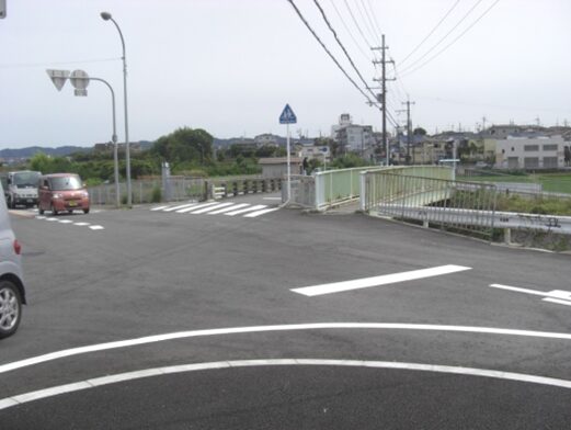 左からの道と合流し広い道の砂子板交差点にでて左に折れて砂子橋を渡る