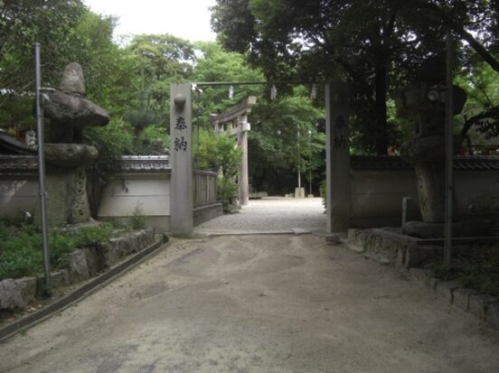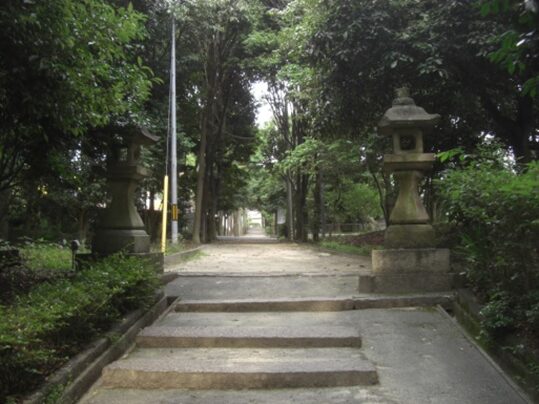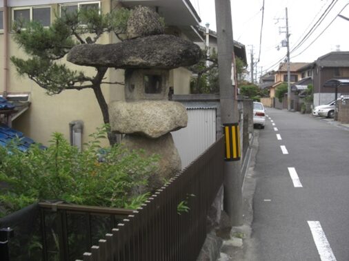 道標と石灯籠の東側の線路を越えたところに建つ 菅原神社参道は線路で分断されている藤阪元町1丁目辺り