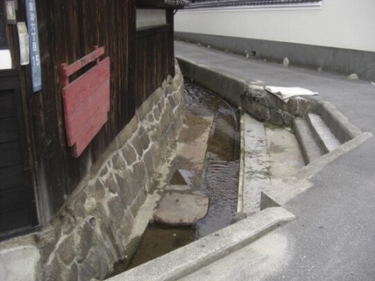 その先左に万代があり、その前を右に入ると今も綺麗な水が流れる 洗い場跡