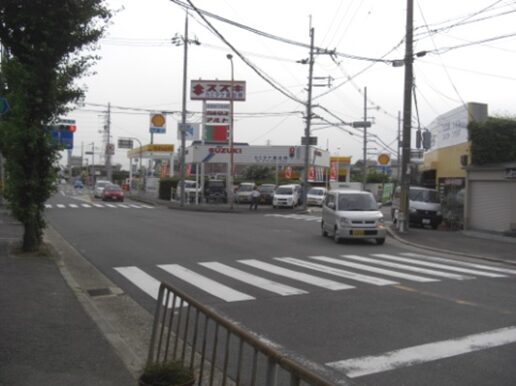 左にGSを見て七号線の大仏町交差点を横断する