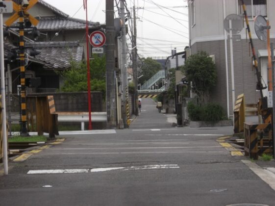街道は突当り、右斜めに進み学研都市線の踏切を渡る