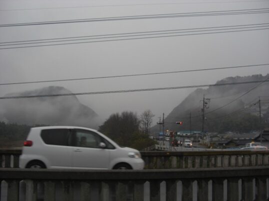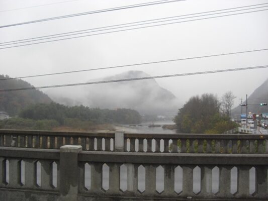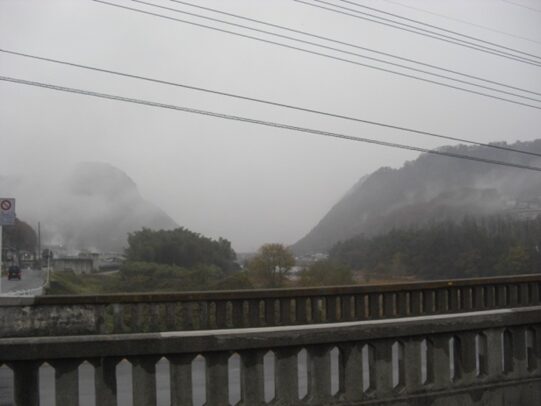 沼田川に架かる本郷橋を渡ります、橋から右手(北)を見ると朝靄で霞んでいるが沼田川を挟んで、向かって左に 新高山城、右に古高山城 が見えるが、残念ながら雨模様でかすんでいます