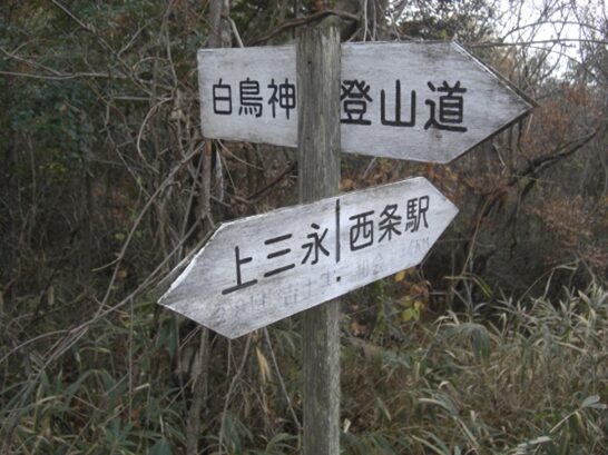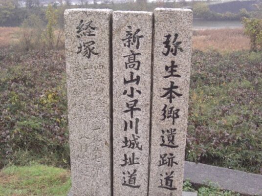 三基の道標 「弥生本郷遺跡跡」「新高山小早川城址道」 「経塚 ・・・・・・」