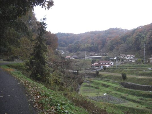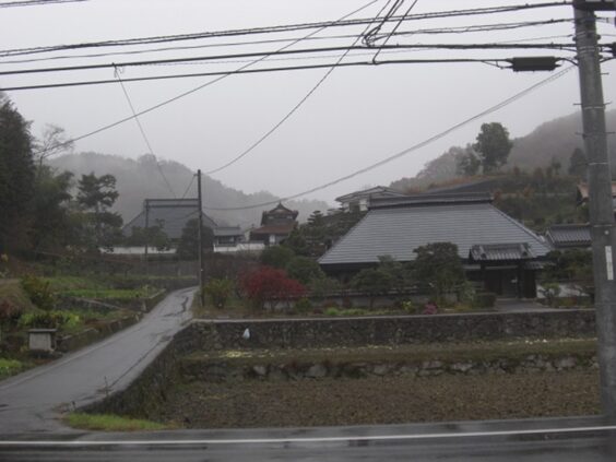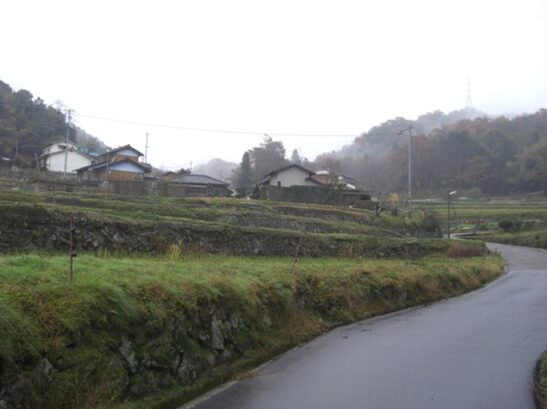 雨がほとんど止んだようですが、どんよりとしていつまた振り出すか分からない空模様。この先、峠越えがあるので少しつらいが、車も通らないし静かな山里を進んでいきます