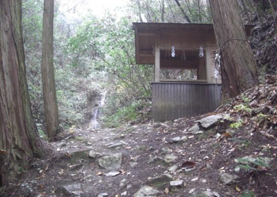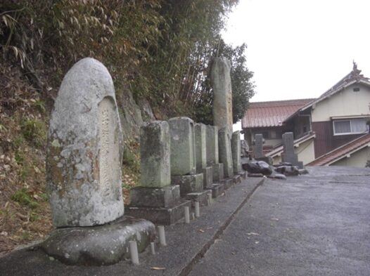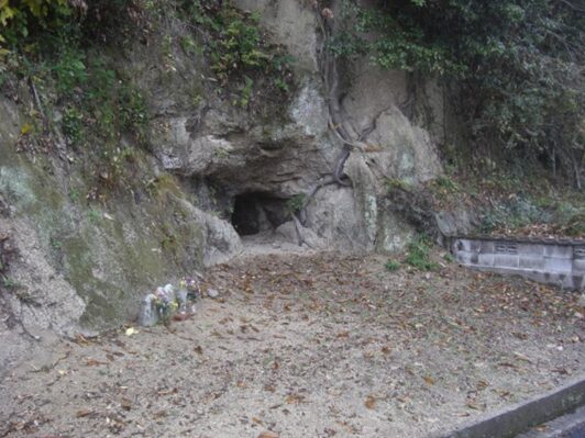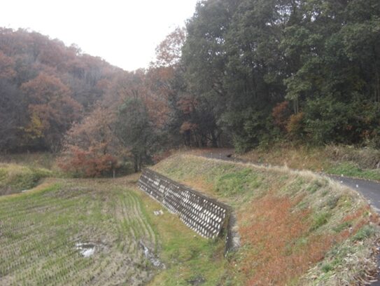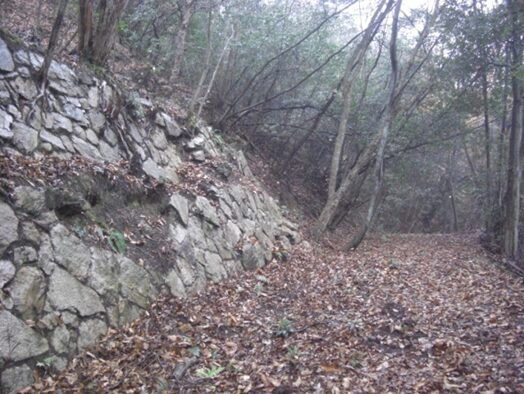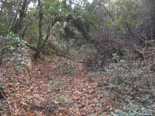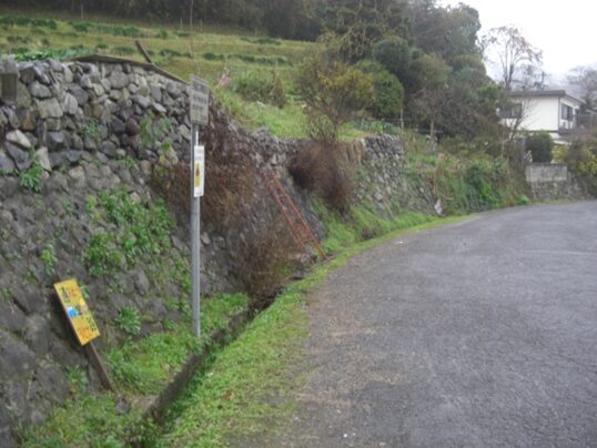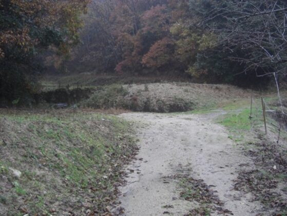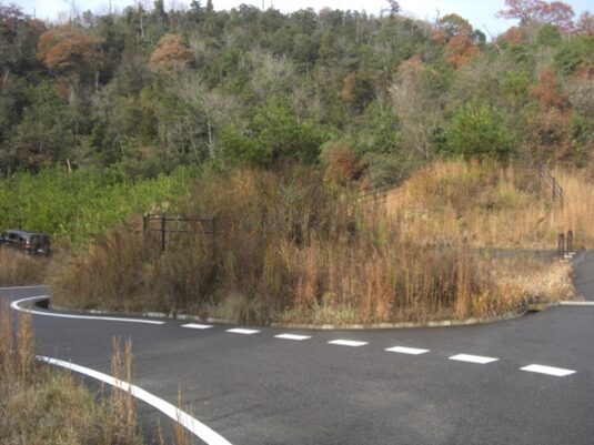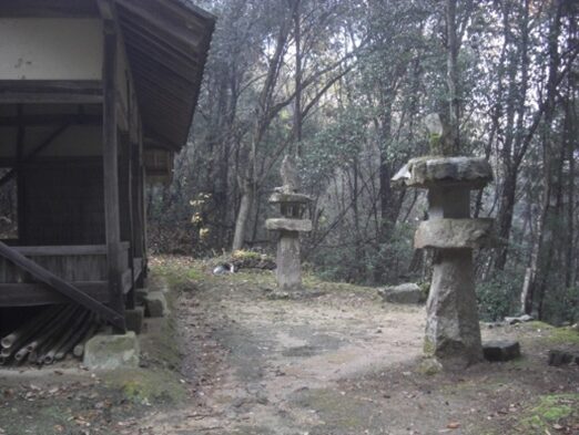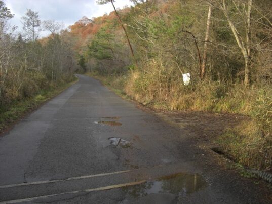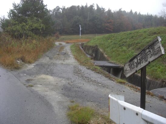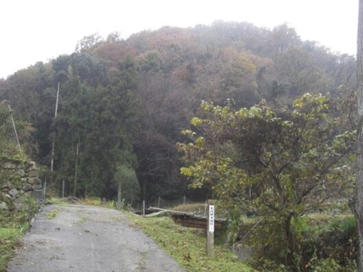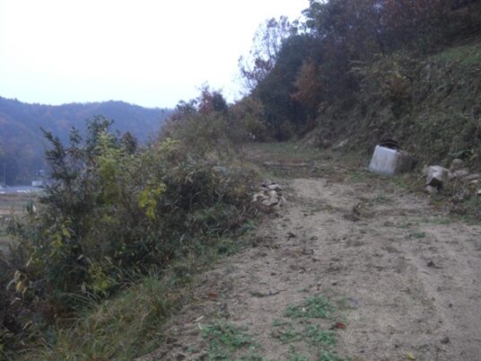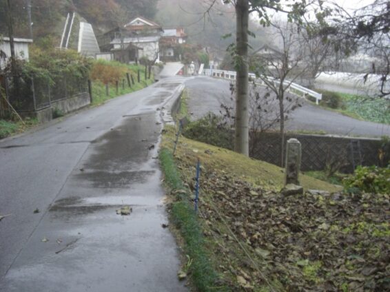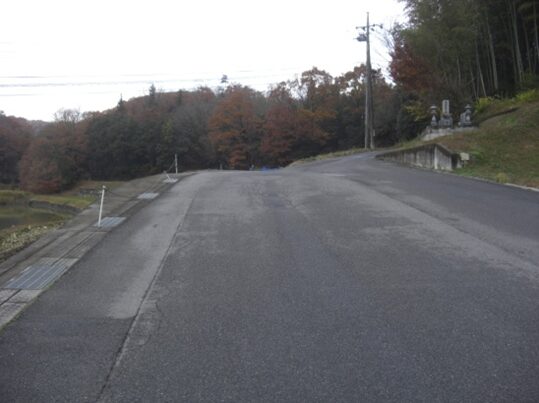 神社の東側で前述のT字路に出ます、右に大きくカーブしたところですぐ道が分岐するところ右に墓があります。旧道は左へ田尾池の方向に進む。広い方の舗装道は産廃の作業道、この先で行きどまりです