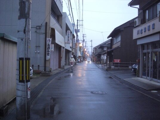 本郷宿を振り返る、朝早く小雨模様なので薄暗い街並み、でも落ち着いたのどかね街並みで気持ちがよい