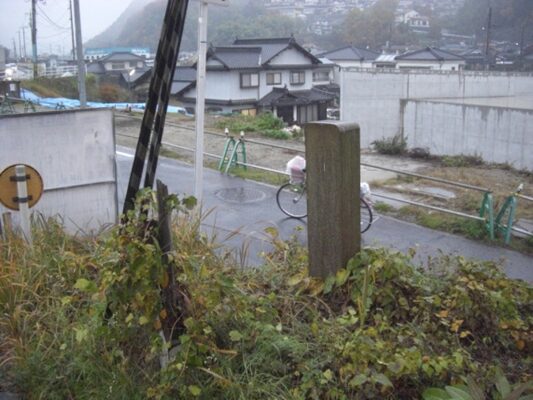 市境の辺り国道2号線は上下線が二本に分離しています。市境から650m程進んだ先で、右に南側の国道の下り線を高架橋で渡るところに出てしまいました。途中350m程戻ったところ民家の数軒集まったあたりで右(北)に折れて国道を渡り、国道の北側に出るのが旧道のようです。その近く左に旧山陽道茗荷清水跡の碑があったのですが見逃しました。