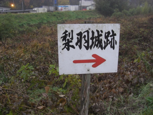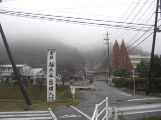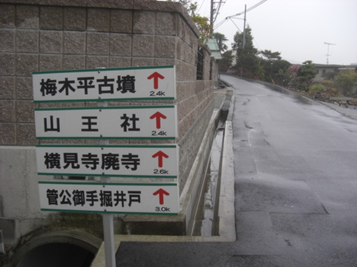 本郷中学校の西側の道を南に下り街道に戻ると、街道角に大きな「史跡 梅木平古墳入口」の看板が立つ