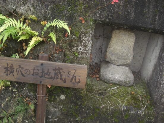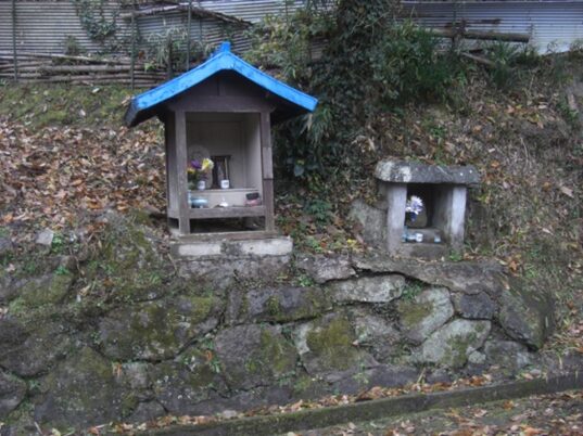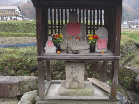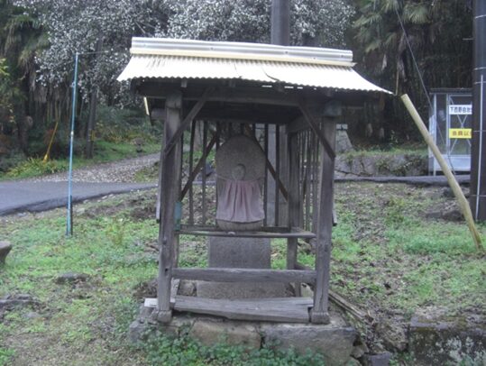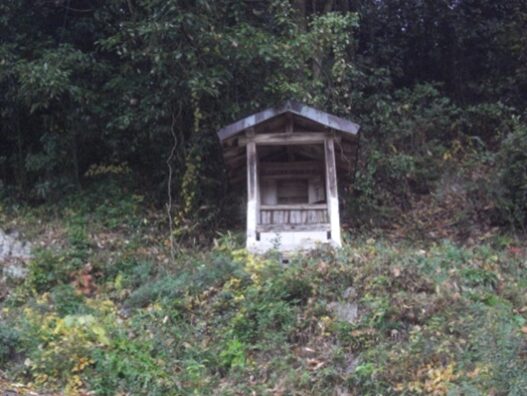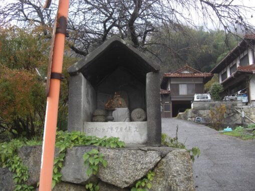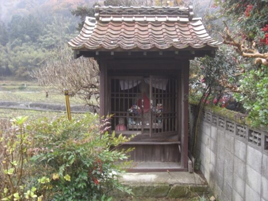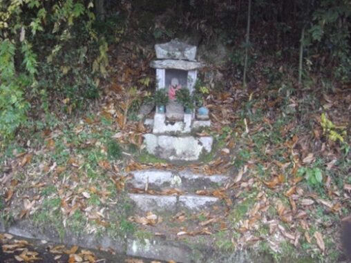 その先左に尾原下集会所がありますその向かい街道を挟んだ先、山裾野の斜面に石造りの小さな 祠のお地蔵さん