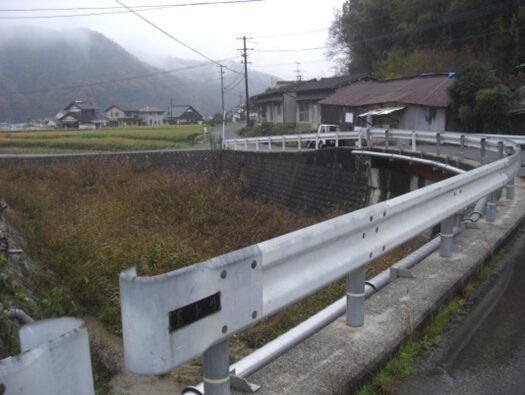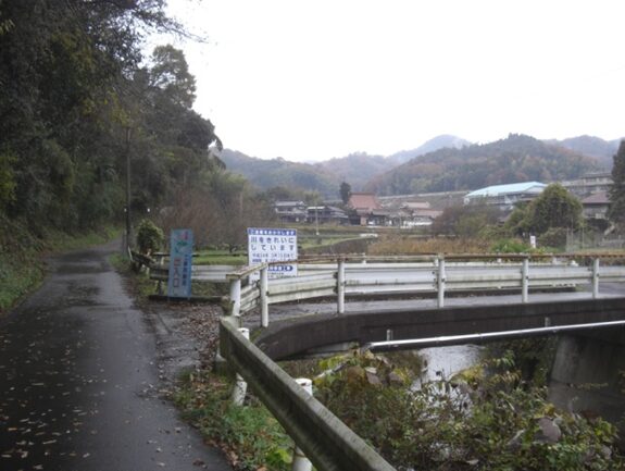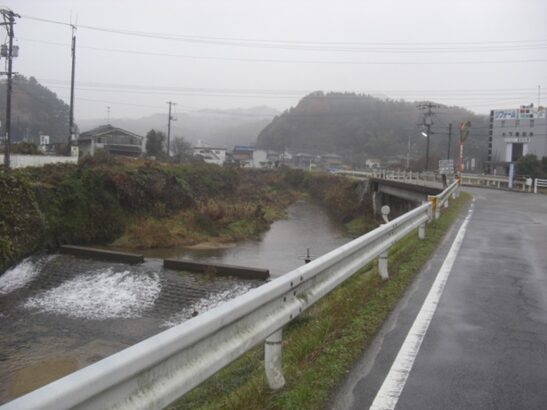 原比川に沿って進んでいくと、少し広い交差点を横断して、その先60m程で左からの道と合流して、右に原比川に架かる橋を渡り西に折れて左に川を見ながら5m程進み375号の吉土実信号交差点を横断します