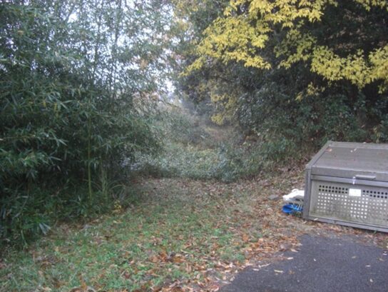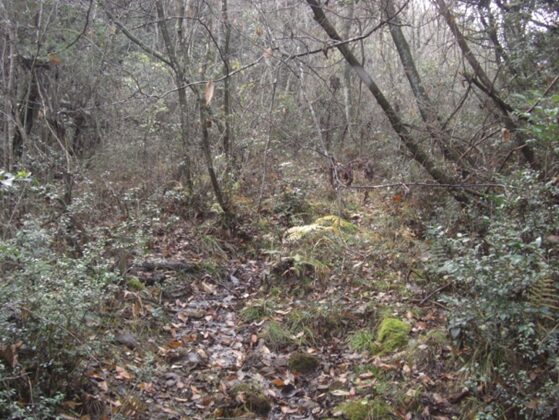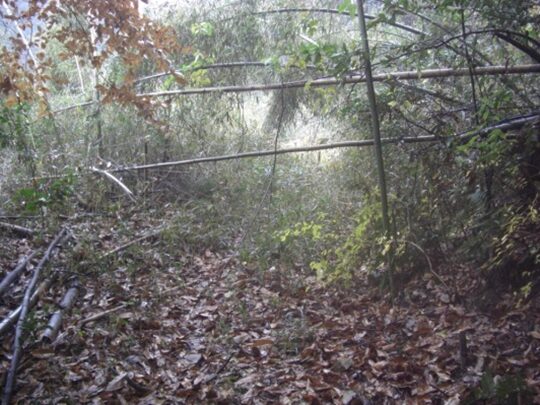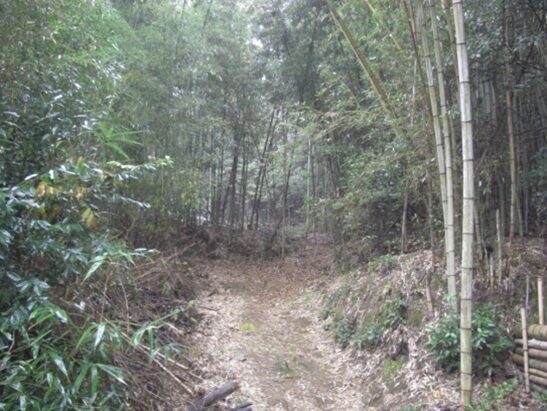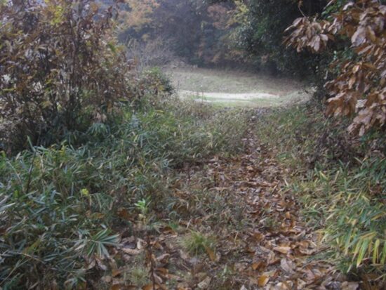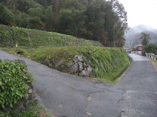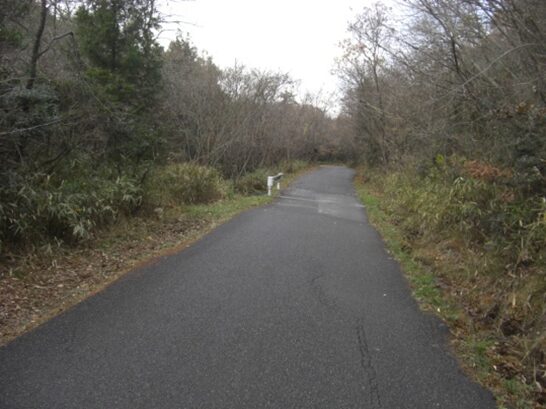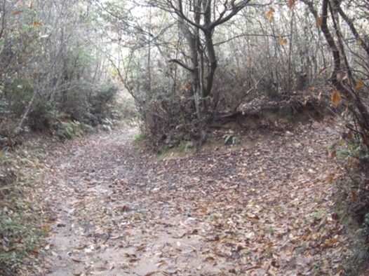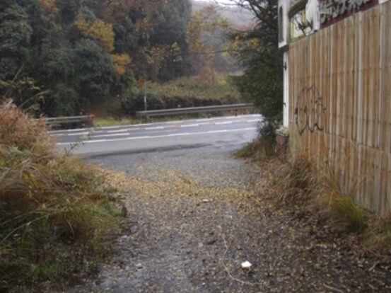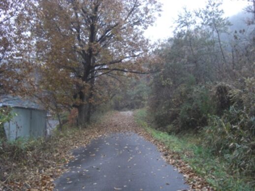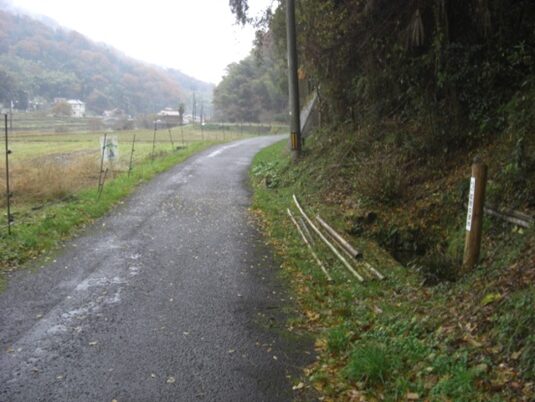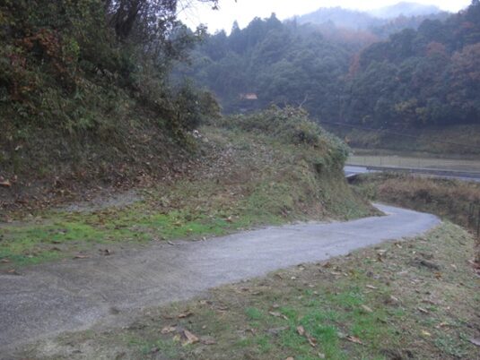 国道より左に入って260m程の所で道は3筋に分岐していますが真ん中の道を進みます。さらに100m程先で左に急カーブしています