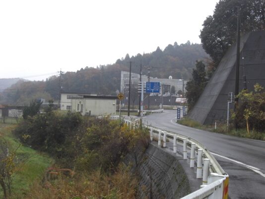 短い旧道を進むと、その先で道は消失しています、ブリキ板塀のところで左に折れて国道に出ます
