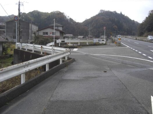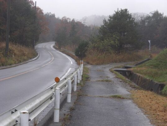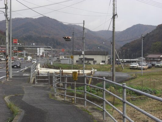 T字路を右に折れて300m余り進み、国道に突き当たる旧道。国道はガードレールで渡れなくしています。再びここからUターンして旧道を進みます