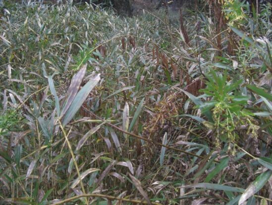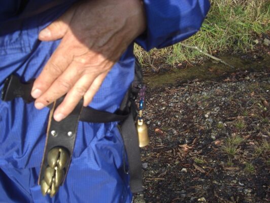 靴をカバーした足元、もう少し脛辺りまででもよいかな。準備万端峠に向かって上ります。念のため鈴も鳴らしながら歩きます。もちろん笛も