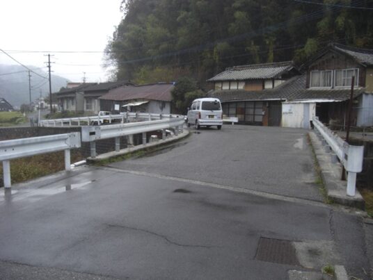 左の宮地川沿いに少し進むと、右に進む道があり右手前角に