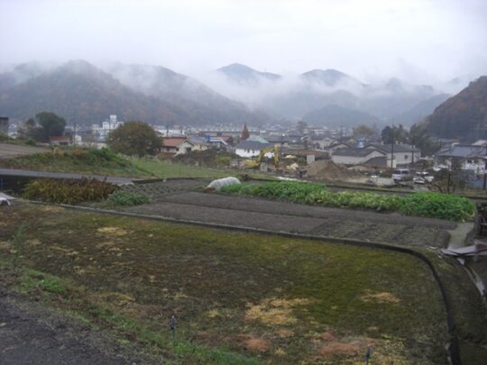 山裾の街道をくねくね曲がりながら坂を上っていきます。途中から振り返ったところです