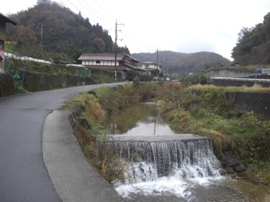 やがて右から原比川が接近してきます西条町土与丸地区途中 歌謡坂の一里塚跡碑(うたうたいさか) があったようですが見逃してしまいました。(原比川の堤の上の民家の前)ホッとして気が緩んだのでしょう