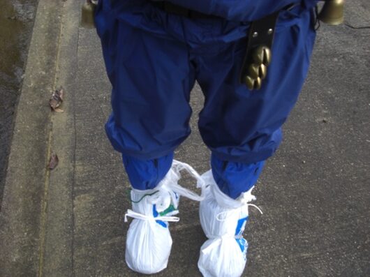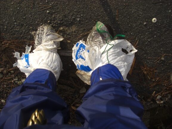 ぬかるみを脱したようです、かなり傷んできましたが大丈夫、靴カバーの袋も破れ健闘の跡です