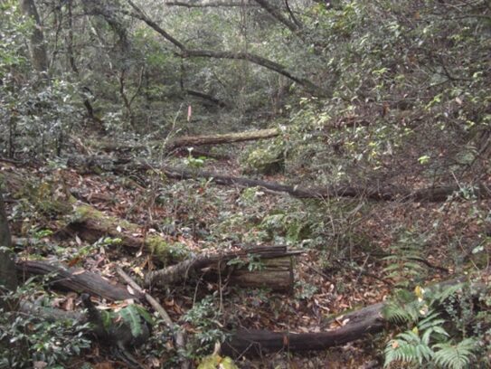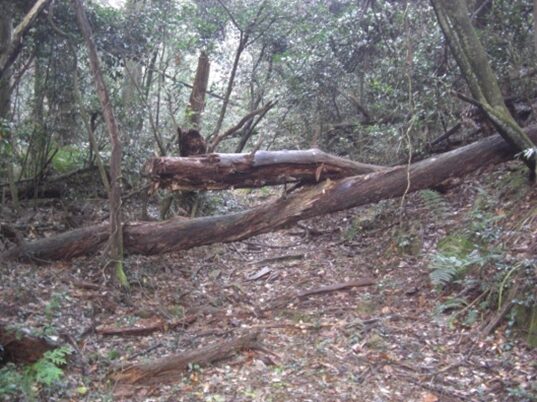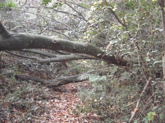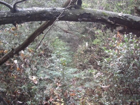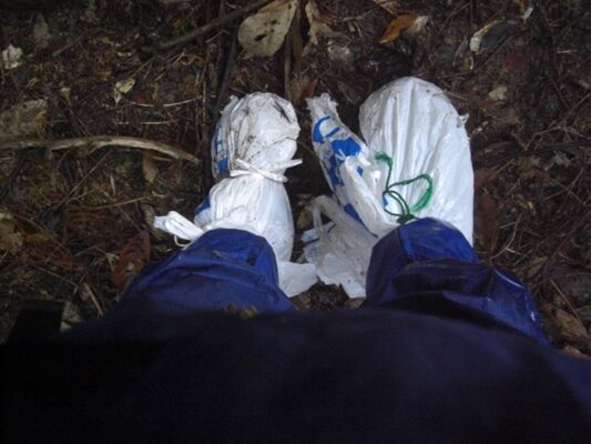 かなり倒木もあり荒れていますが、踏み跡がハッキリあるので大丈夫です、でもぬかるみ道に足を取られ、木の上に乗るとどうしてもビニール袋で滑りやすい、そちらに気を取られ道を間違わないように細心の注意