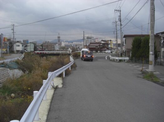 渡ったところで、すぐ左に折れて200m程進んだ先で右にカーブして、北側の国道の高架下をトンネルで抜けます。抜けたところで右に折れて国道に沿って200m余り進み左にカーブしますとすぐT字路に出ます。T字路を右に折れて300m東に進むと、北側の国道に突当り、前述の失われた旧道の北側に出ます