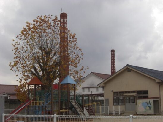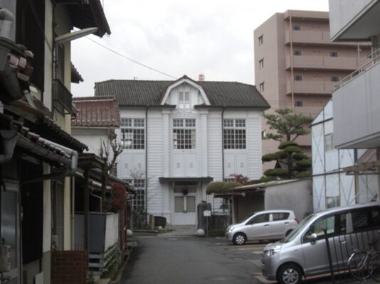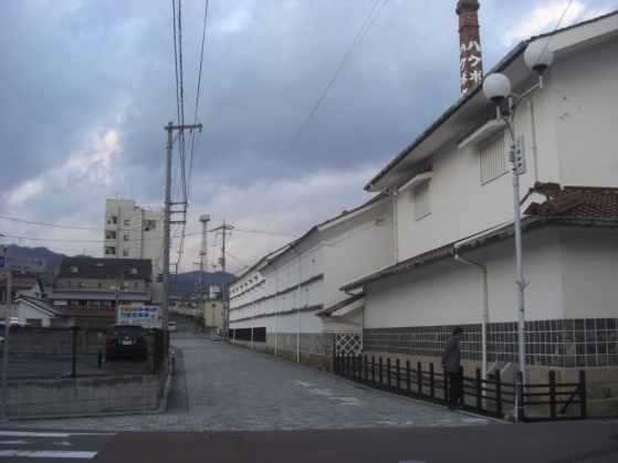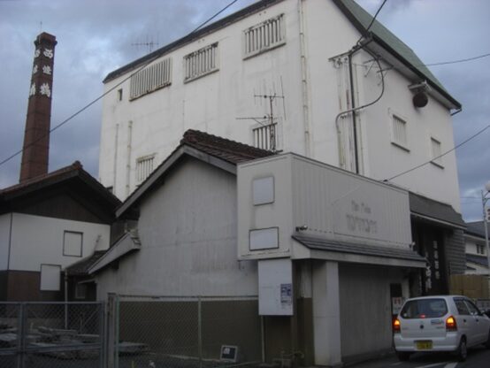 土与丸交差点を横断して直ぐの分岐を、左(西)に折れて進むと一筋目の右に 賀茂鶴吉富蔵の赤レンガの煙突がある工場
