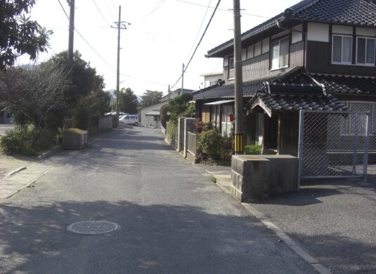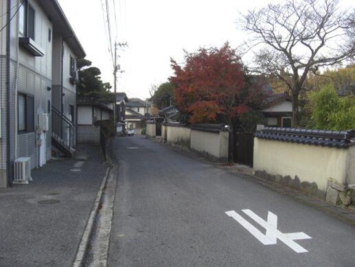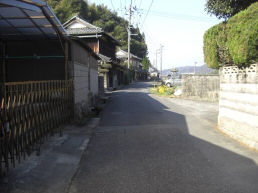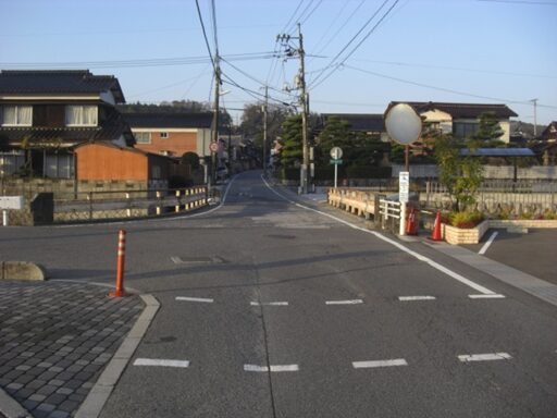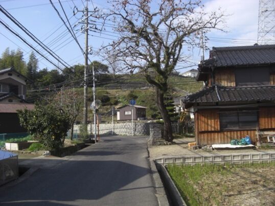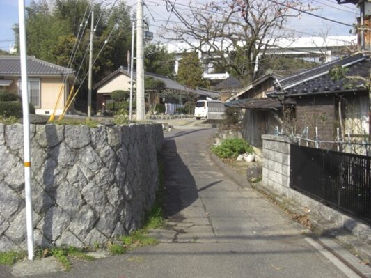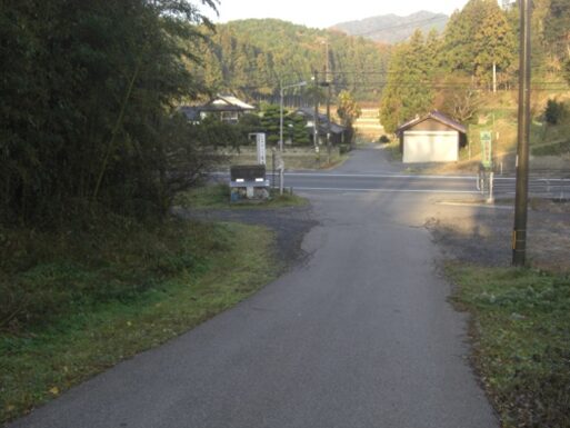 さらに350m程ほぼ真っ直ぐ西に平野地区を進みますと、民家の角で道は分岐します。 旧道は右の道ですが少し先で消失しますので、左の道で迂回します