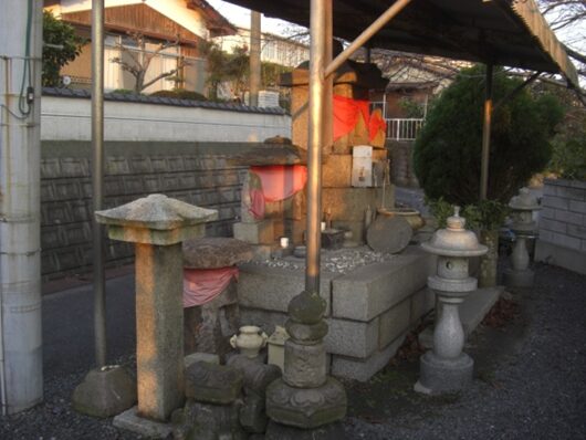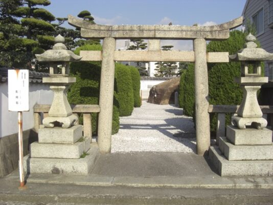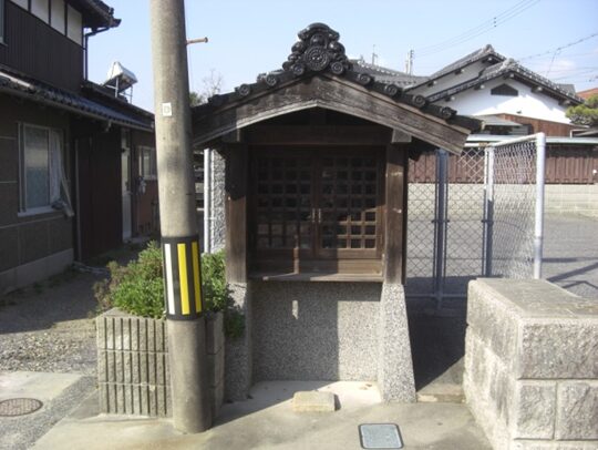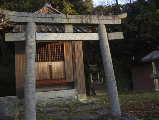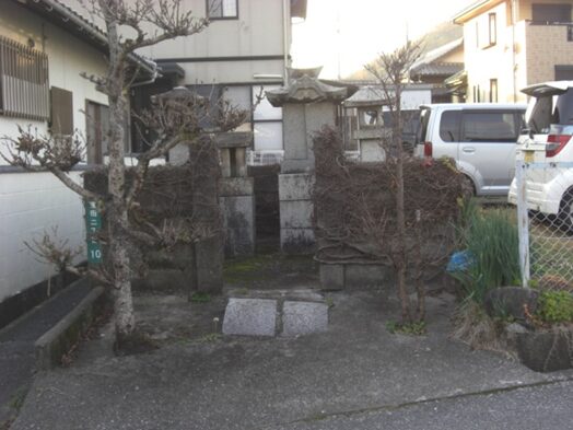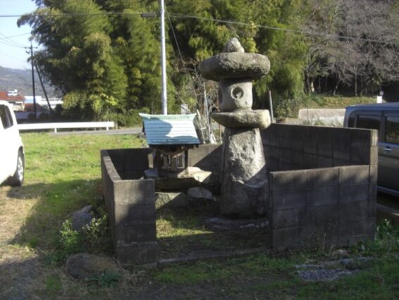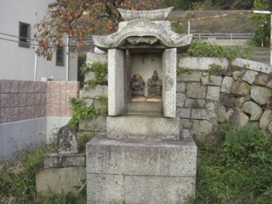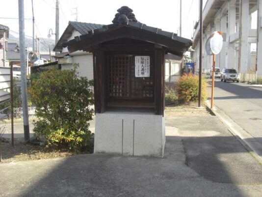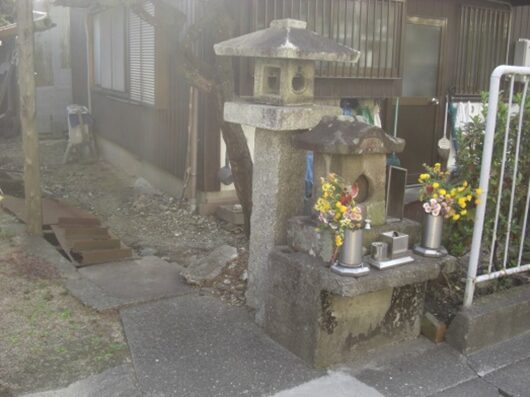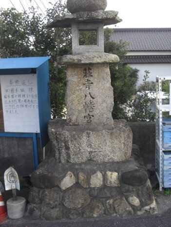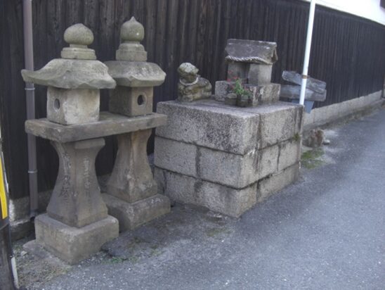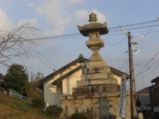 すぐ左手に小さな 石造りの祠と常夜灯 常夜灯は荘寺八幡宮(山崎八幡宮)の常夜灯
