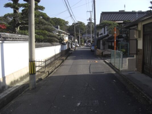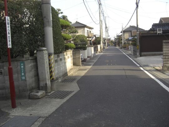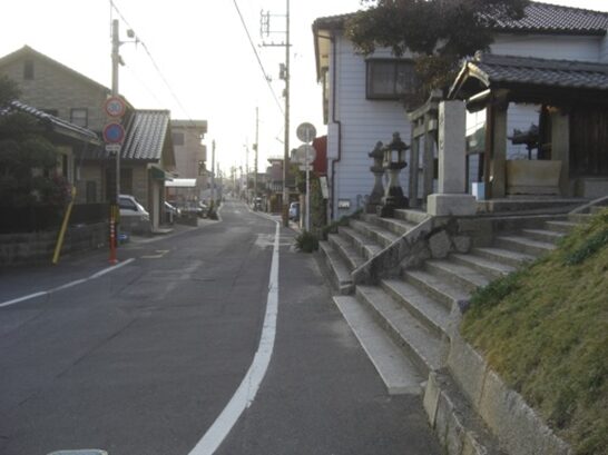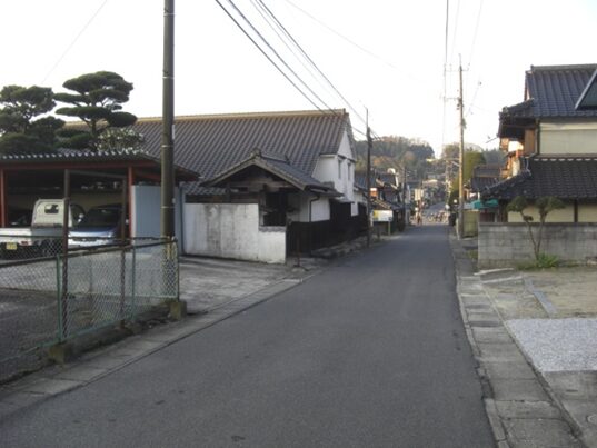 川崎三丁目から街道を振り返る、明石地区の往還松の枯根が石垣のところに二本残っているそうですが見当たりません