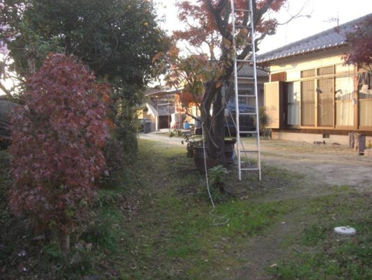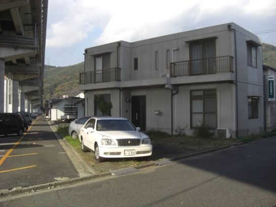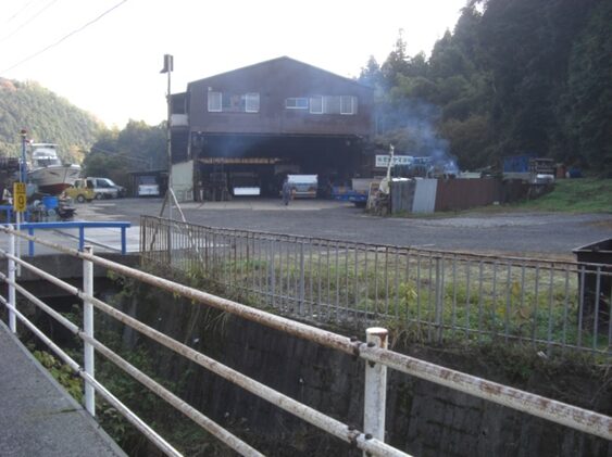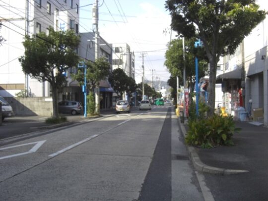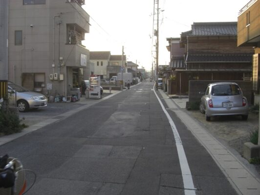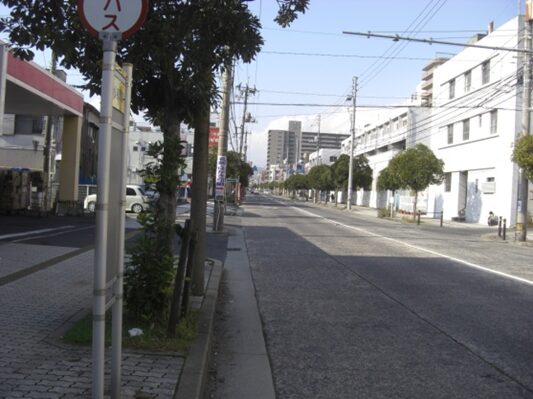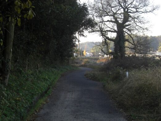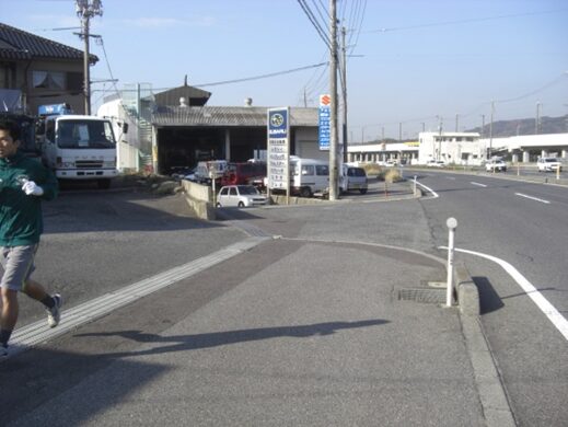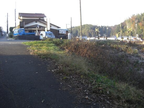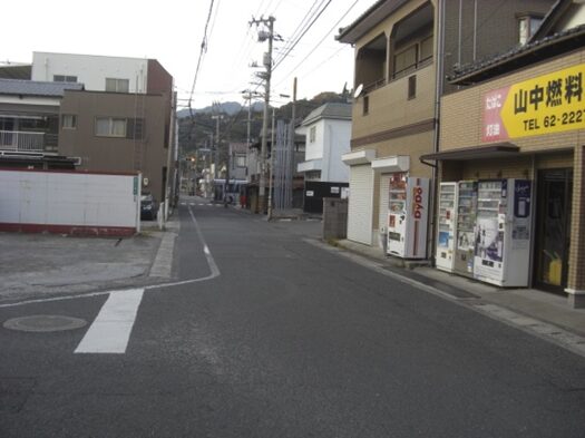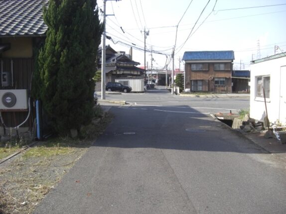 その先左にモトヤマ運輸があり、向かってこの建物の右辺りに、前述の民家の横の消失した道が林を抜けてきていたのではないだろうか。道筋としては十分つじつまが合います。モトヤマ運輸を振り返ったところです