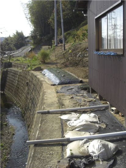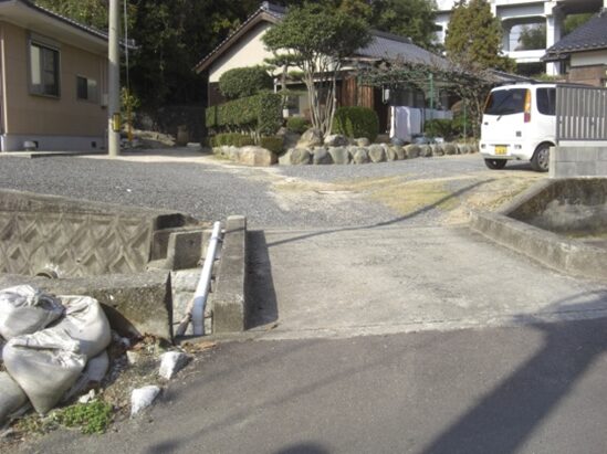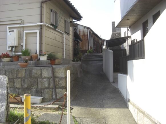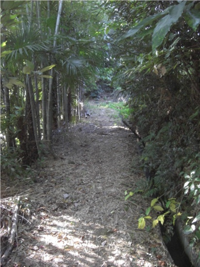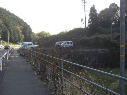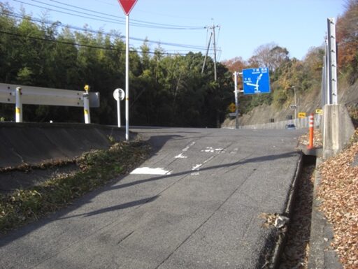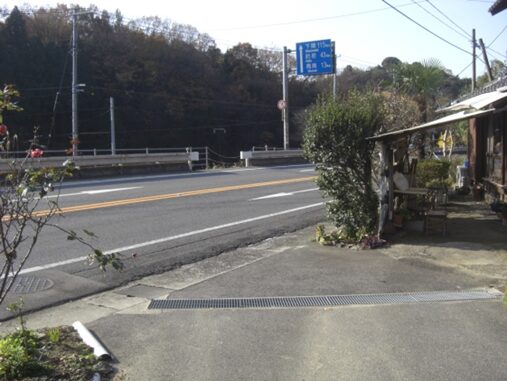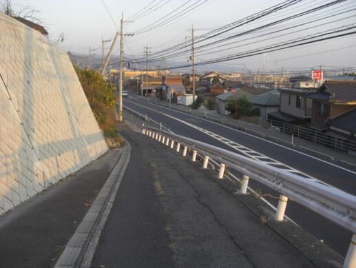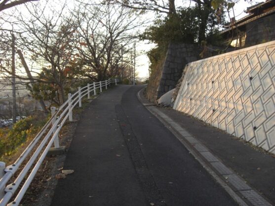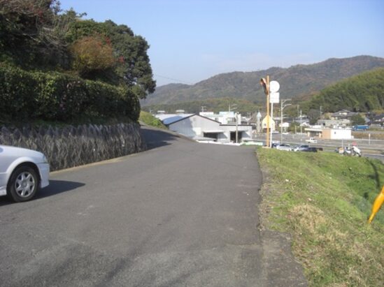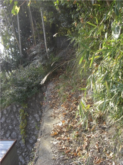 347号線からの擁壁の間の坂道、347号線はかなり削られています