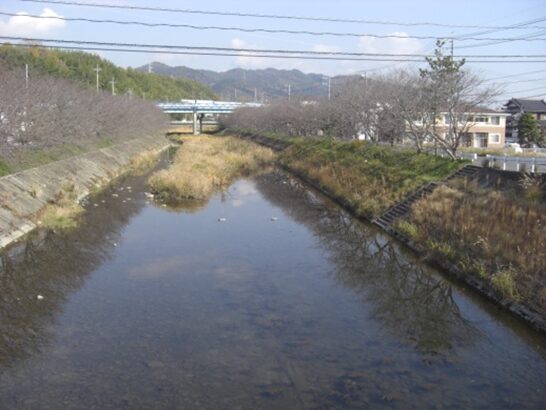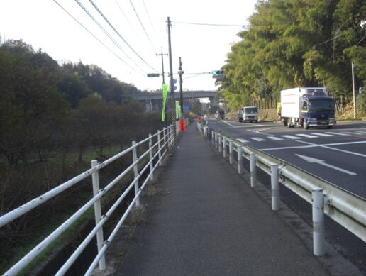 山陽道の交差点に戻り、西に150m程進むと川を渡ります、そのすぐ先右斜めに進むと2号線が右から合流します