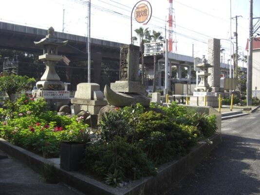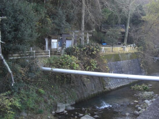 切戸川に架かる久保市橋から神社全体を見る、鳥居の横に 大師堂