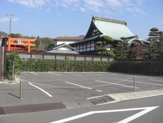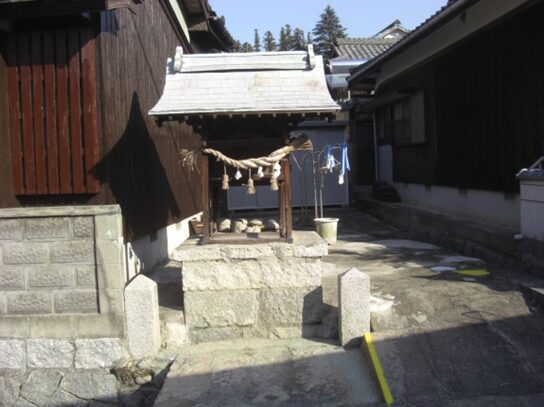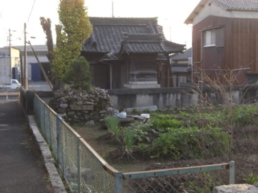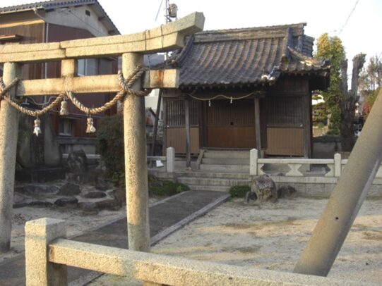 分岐から90m程進み、左(南)の筋を見ると山陽本線と道路が見える手前に 八坂神社(祇園社)があります