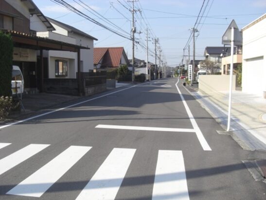 分岐から400m程街並みを進むと車道の交差点に出ます、街道は真っ直ぐ進みます