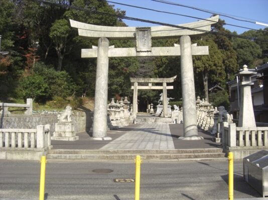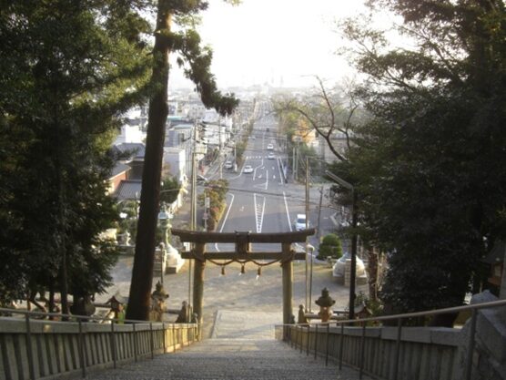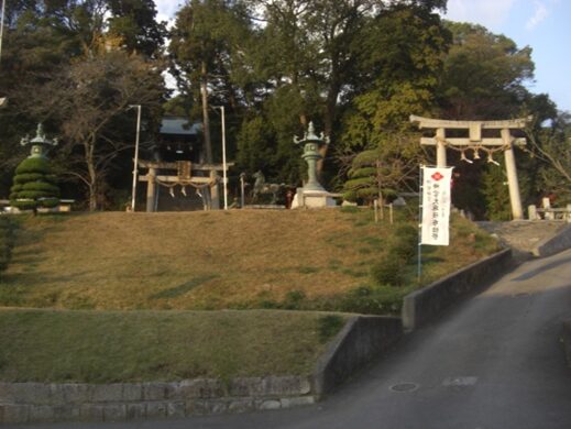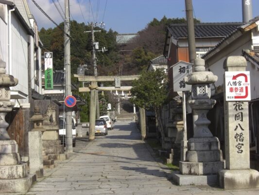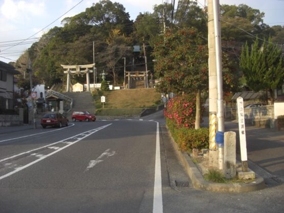 右に折れて60m程で街道は左に折れますが、その正面に山崎八幡宮が見えます、背後の北東に永源山(89.9m)があり、公園として展望台などがあります