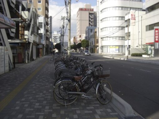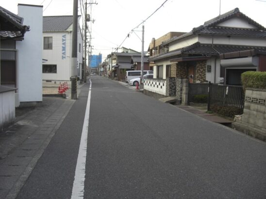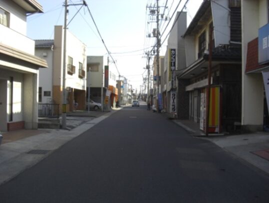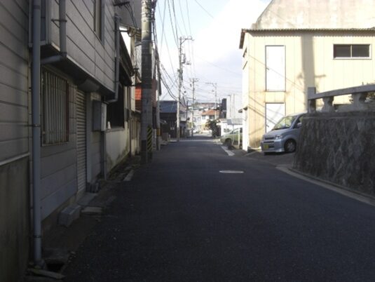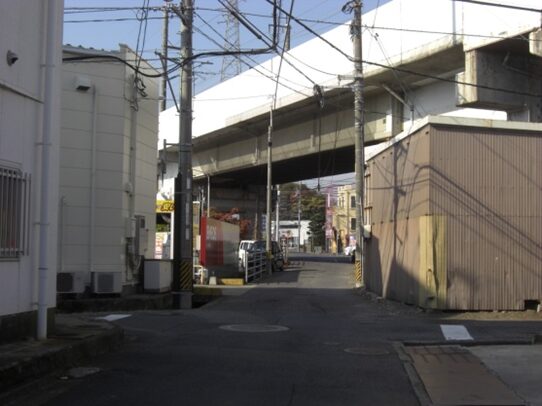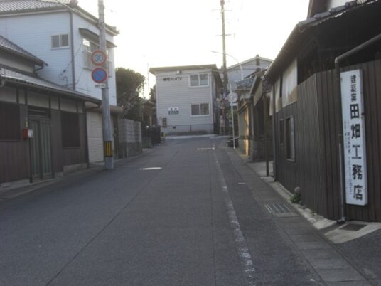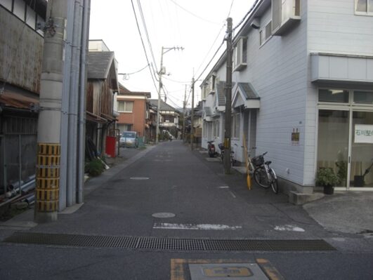 その先100m程で十字路を横断して、さらに100m程先でT字路になります。横町に入り、正面に横町ハイツの建物があります。街道は左に折れますが