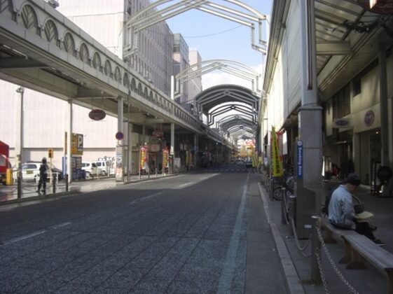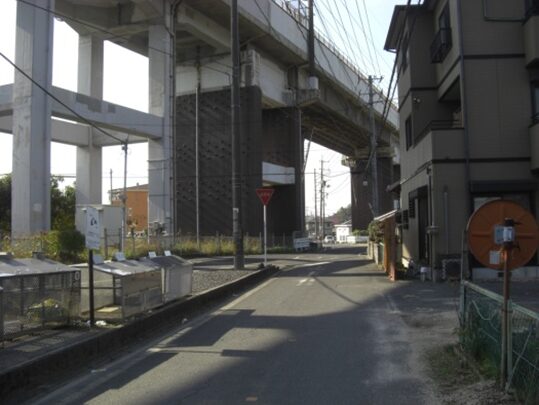 西北に街道を進み、右の久村酒店のすぐ先で山陽新幹線の高架を潜ります