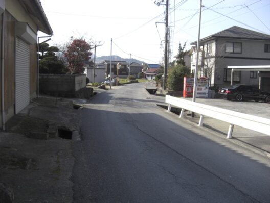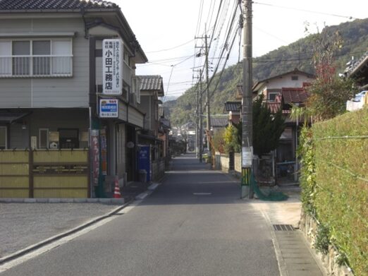 その前に、右の旧道を入っていきます、住宅が建ち並び、旧道は80m程先で消失しています。右(北)側の347号線を挟んで高くなっています。かつてここから上り坂道になって高台への温田峠への旧道が通っていたようです
