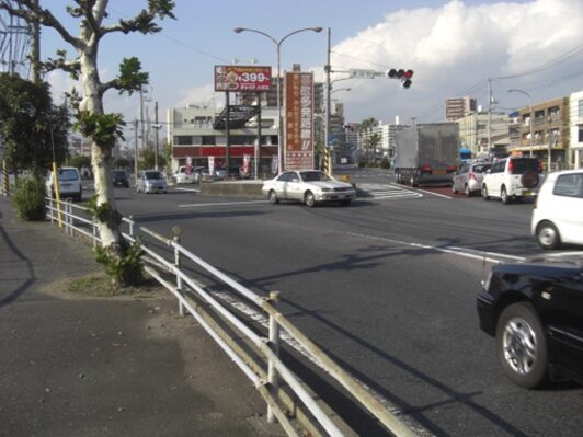 その先左に大きく弓なりにカーブして進み岩徳線のガードを潜ると、二ノ瀬信号交差点に出ますので右の広い道に折れます